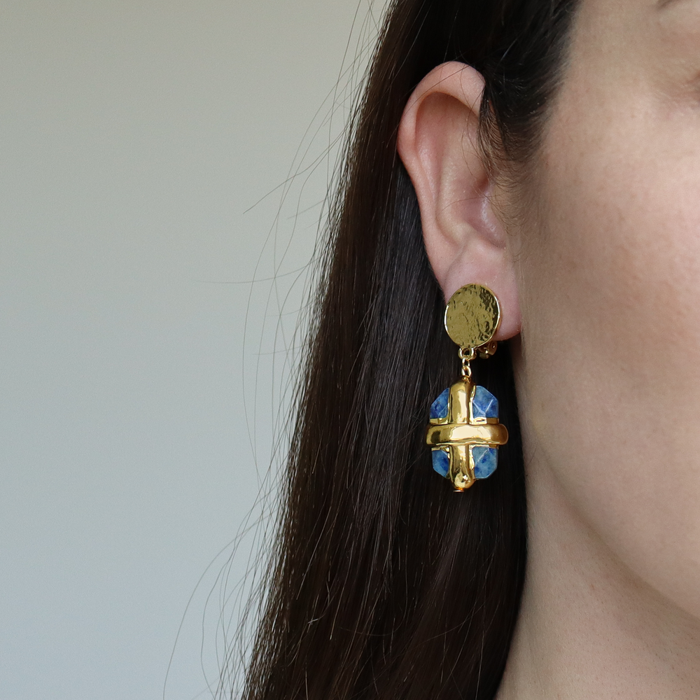 No piercings needed to make a statement. These elegant clip-on earrings pair a small gold coin top with a bold Lapis stone charm in a deep, ocean-night blue. Comfortable and eye-catching, they’re designed to elevate any summer outfit with a touch of effortless sophistication.