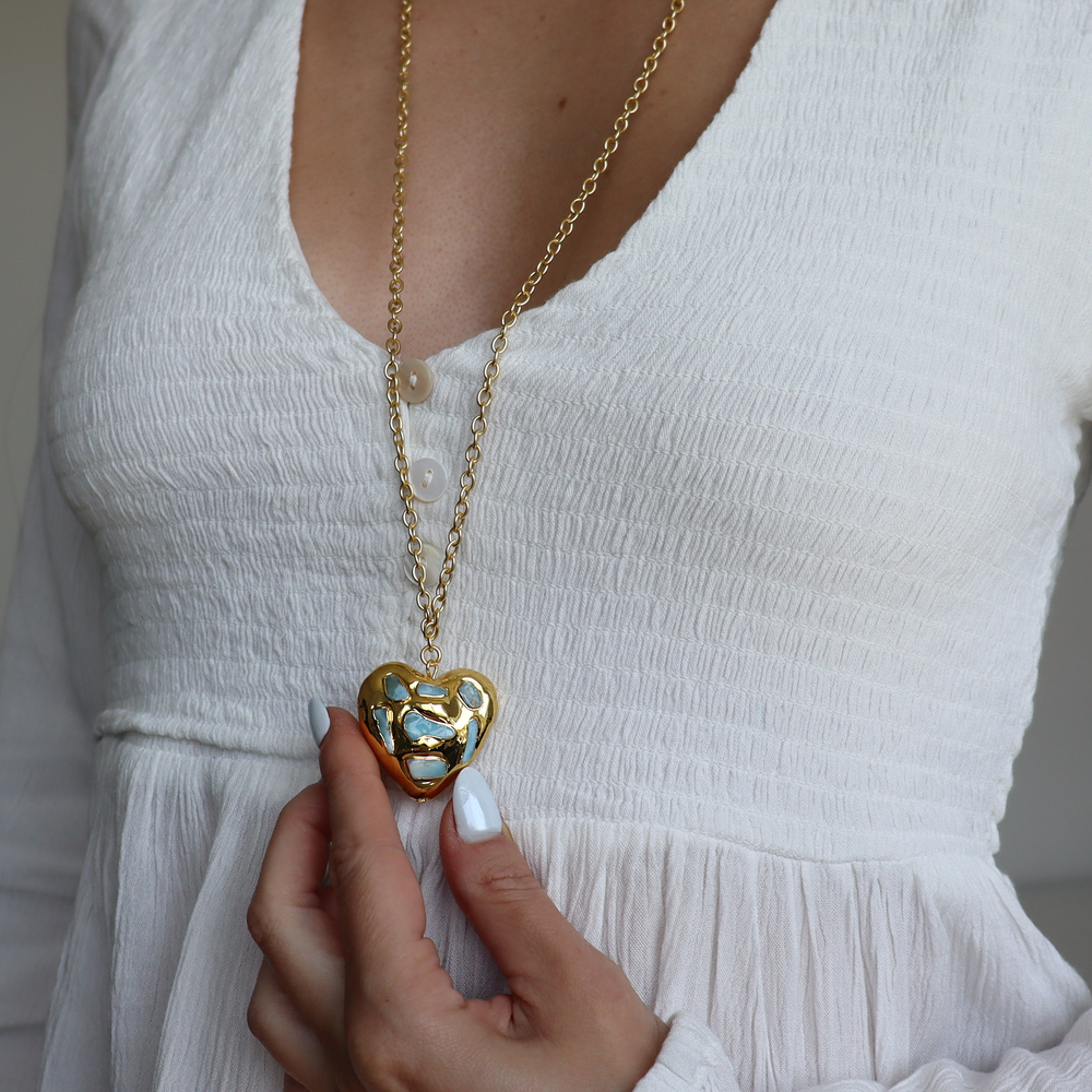 A heart born from the sea. The Kokoro Long Chain features a long, flowing gold chain and a bold heart-shaped pendant encrusted with amazonite stones in soft ocean blue. The name Kokoro, meaning “heart” in Japanese, reflects the spirit of this piece — full of emotion, light, and movement. Inspired by sunlit shores and salty breezes, it’s the perfect statement necklace to anchor your summer style.
