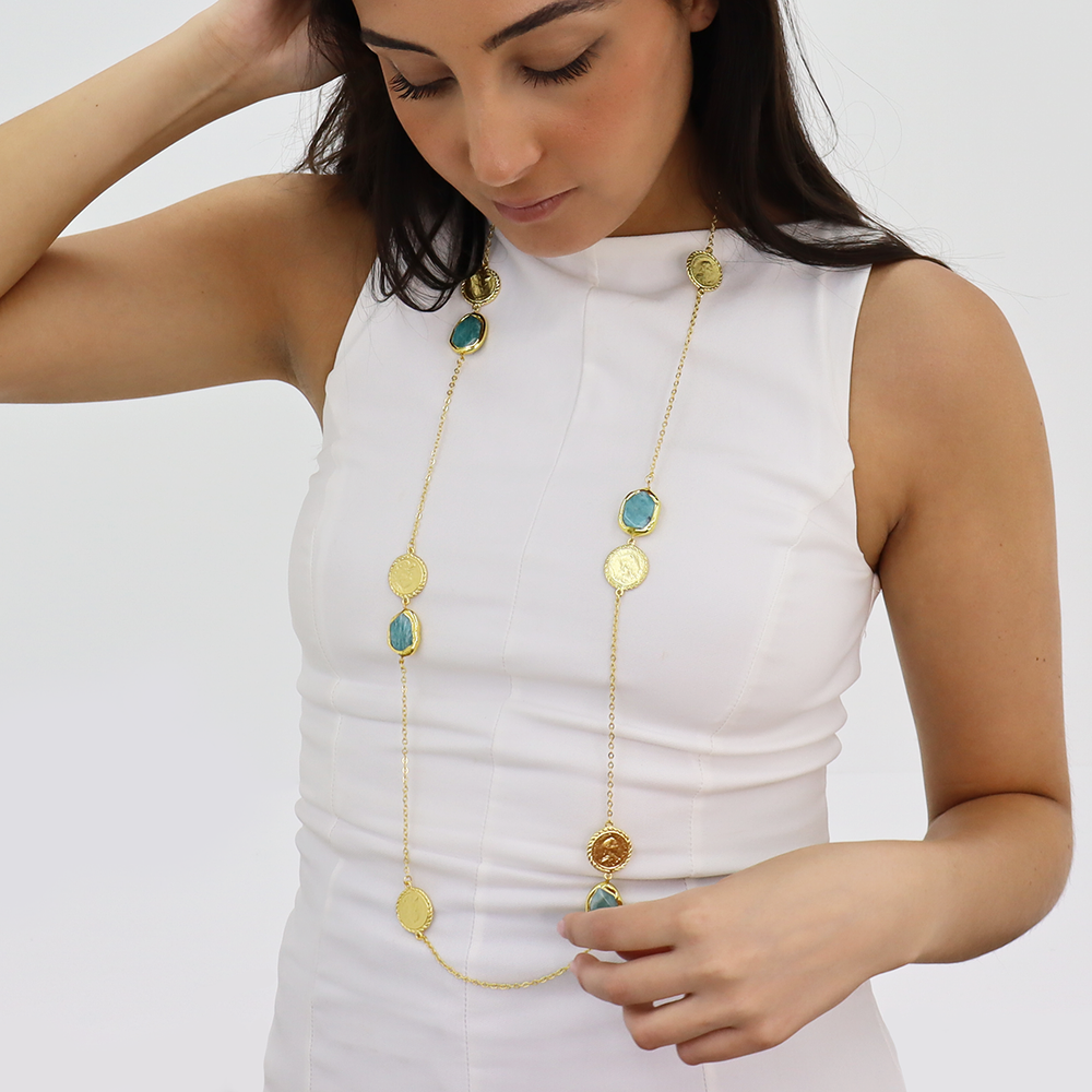 This elegant long station necklace features a delicate gold chain adorned with shimmering coins and vibrant Amazonite stones. Its versatile design adds a touch of sophistication to any outfit, effortlessly blending classic and contemporary elements. Perfect for layering or wearing alone, it’s a timeless addition to your jewelry collection.