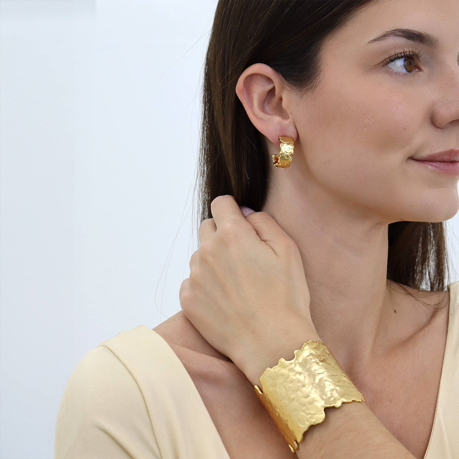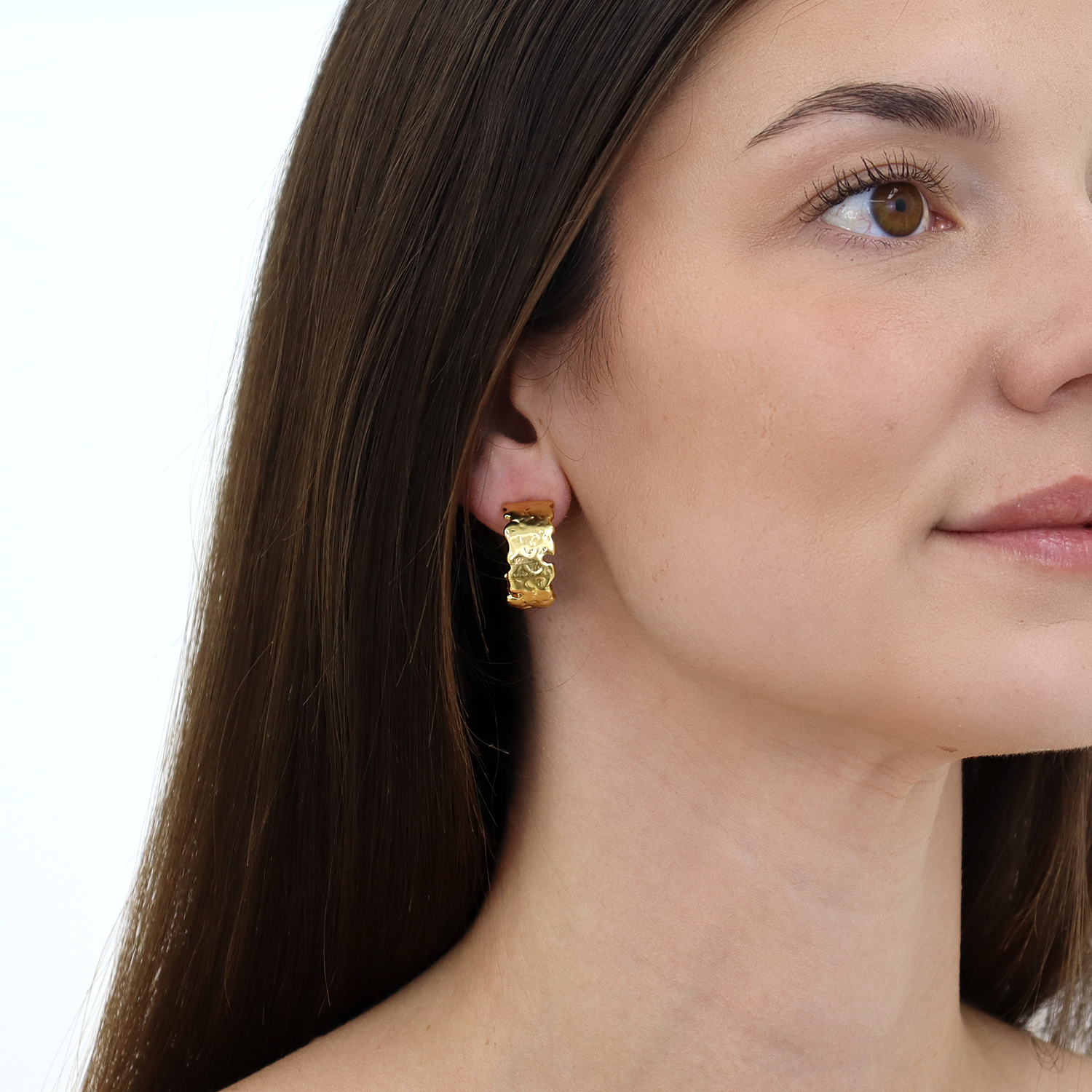 Molten Metal Hoop Earrings feature a sculpted, fluid silhouette inspired by softened, organic forms. Designed as a petite everyday hoop, each piece is plated in luxurious metal and finished with a textured surface that adds depth without feeling heavy. Bold yet refined, they bring effortless character to both casual and elevated looks.