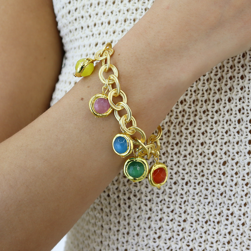 Beautiful charm bracelet featuring our signature etched link collar chain adorned with a series of colorful faceted beads charms.
