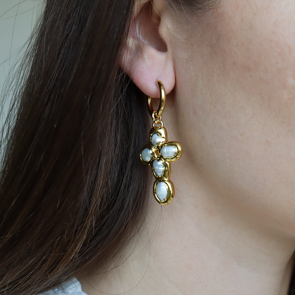 A dreamy drop from the deep. The Mermaid Cross Earrings feature delicate cross-shaped pendants made of pearls, evoking treasures washed ashore. Light-catching and luminous, they bring a touch of ocean magic to any look. Perfect with a simple white shirt or a breezy linen outfit, they add effortless charm to sun-kissed days and coastal evenings.