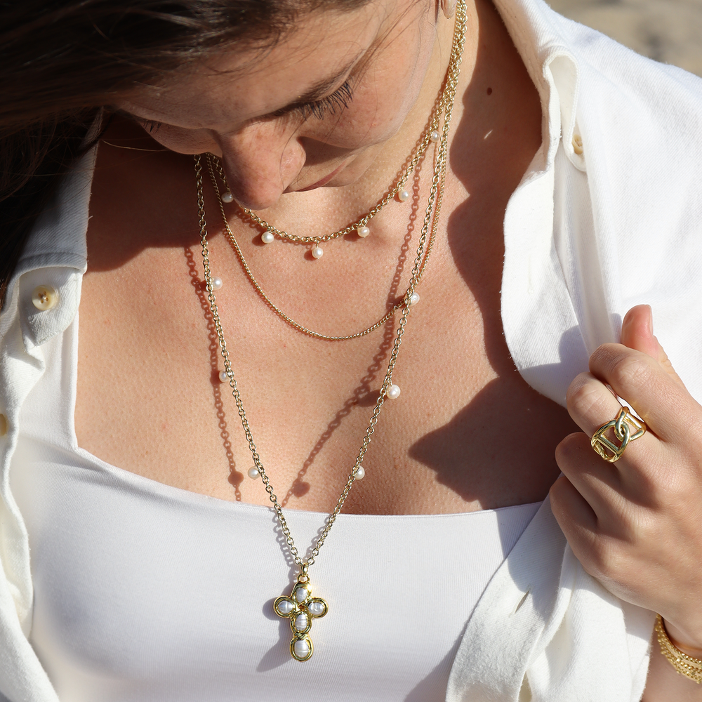 Elegant and modern, this three-layer necklace combines delicate gold chains with tiny shimmering pearls, finished with a stylish pearl cross-shaped pendant. The clean, contemporary design adds a subtle geometric touch that’s perfect for layering or wearing alone - a versatile piece to elevate any outfit.