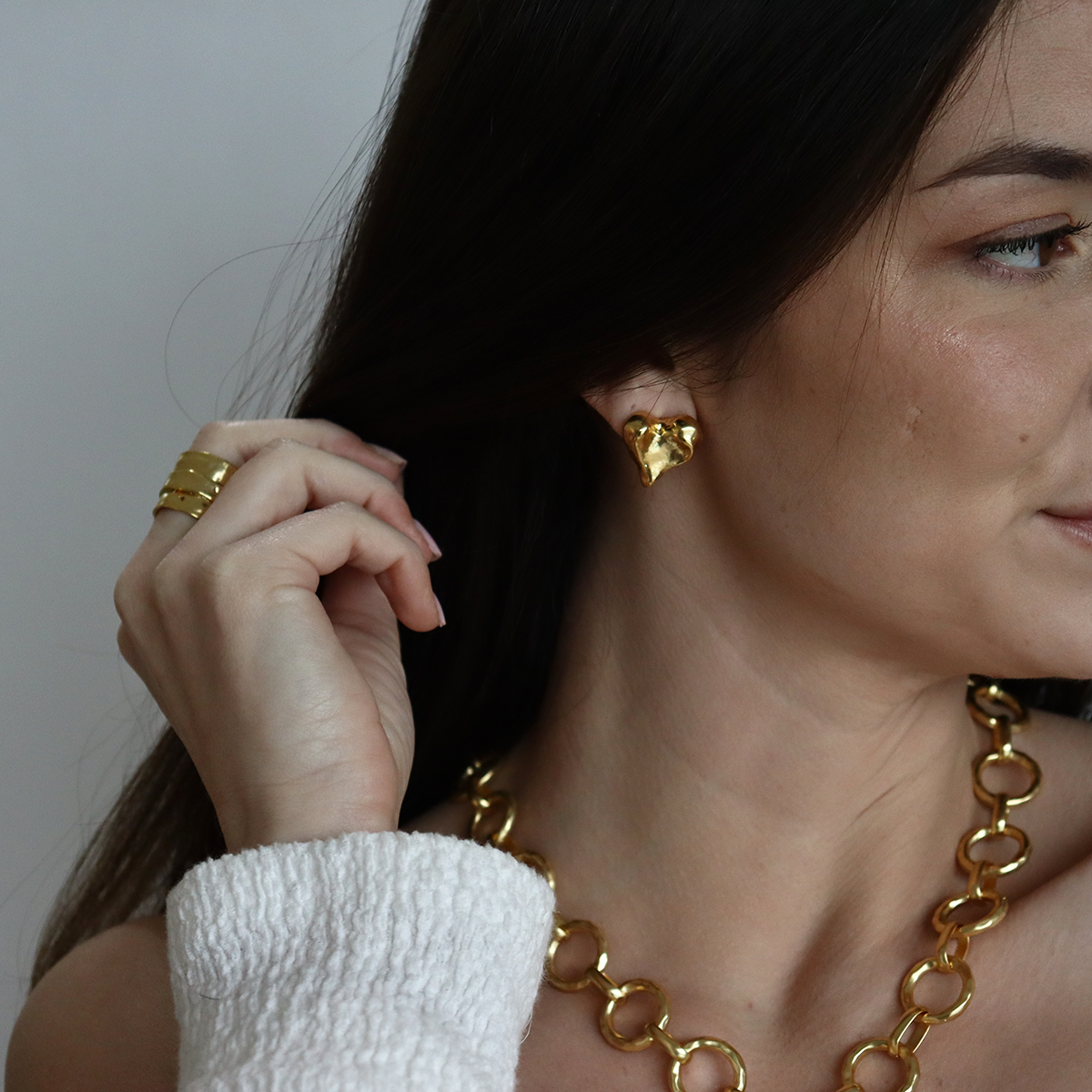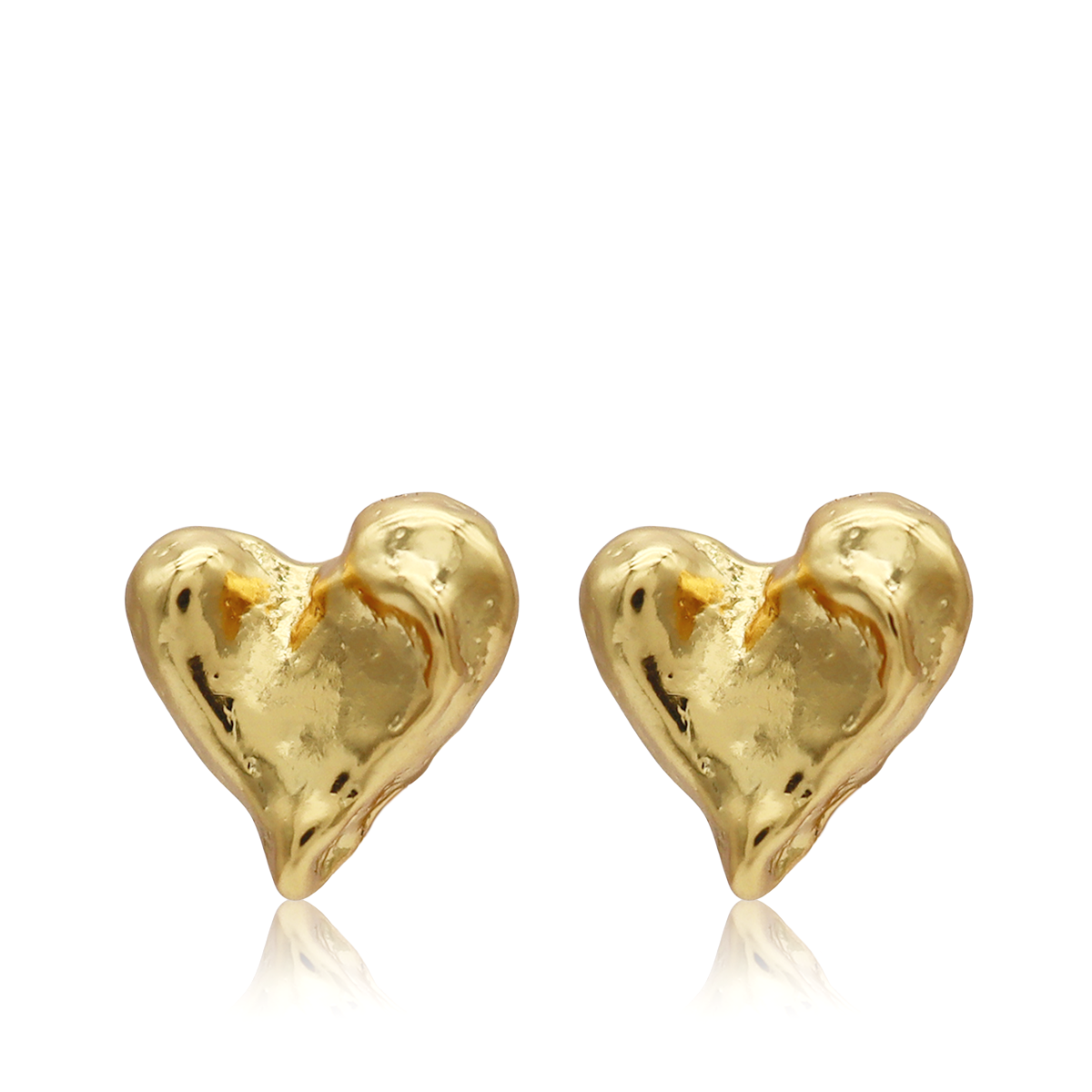 Softly sculpted heart-shaped stud earrings with an organic, hand-formed look. The gently irregular curves and polished gold-tone finish give each heart a warm, fluid shine, creating a modern yet romantic feel. Designed to sit perfectly on the ear, these studs are easy to wear and effortlessly timeless.