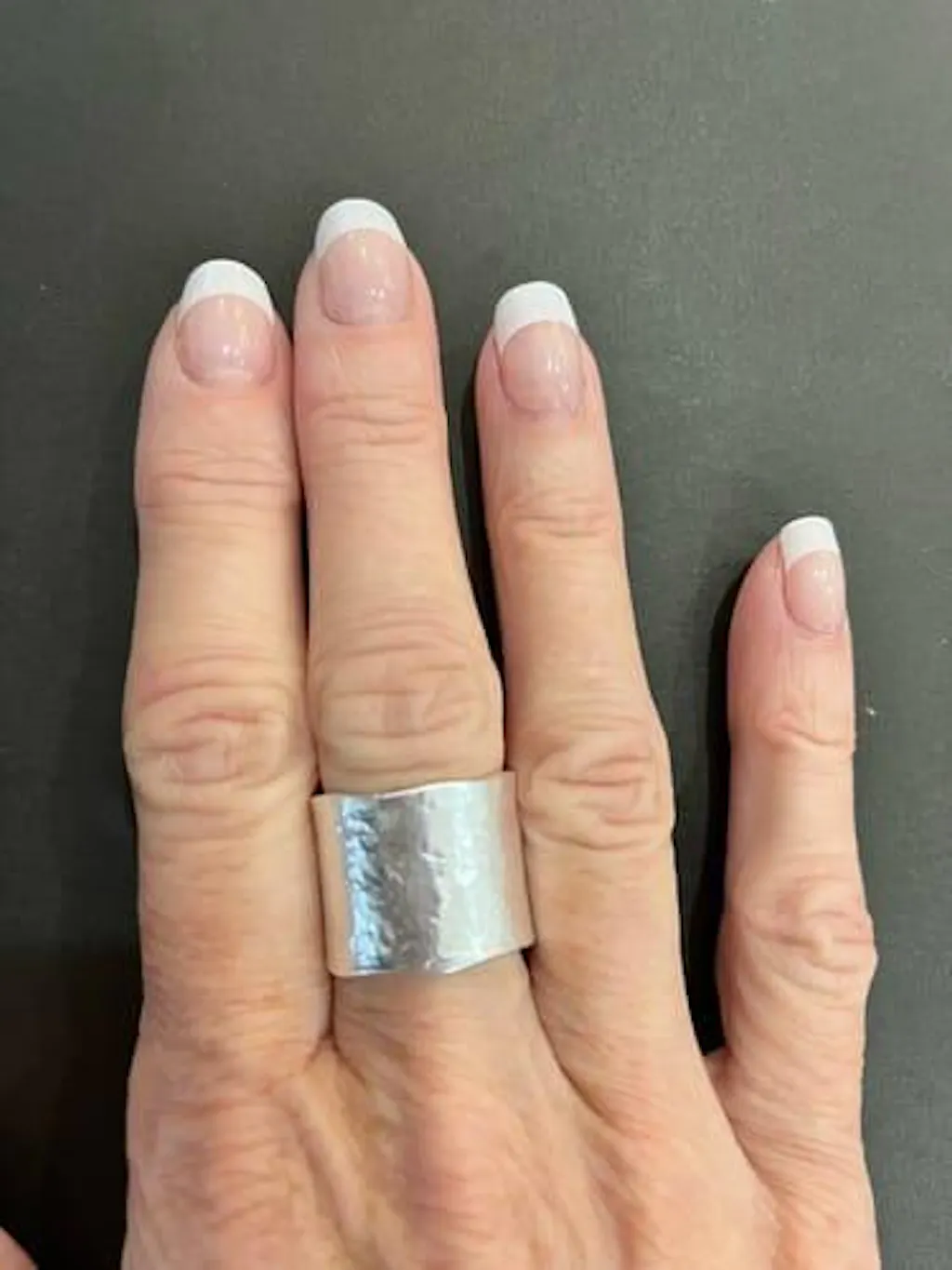 This artistic large ring is made in a free form shape with a high shine and slightly hammered finish. This gorgeous ring is all you need to make a statement in style.